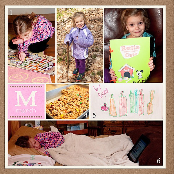 1 - Regan adds new quarters to her collection of States. 2 - Sage and I venture outside, ready for some sunshine after a long winter. 3 - Sage author’s her first book. 4 - Family favorite, Cheerio bars. 5 - Regan’s rendition of our new bottles. One of the pieces displayed in her and Sage’s art gallery throughout the house. 6 - Regan, not feeling well, rests in our bed and listens to some ‘Tales2Go’ on the ipad.